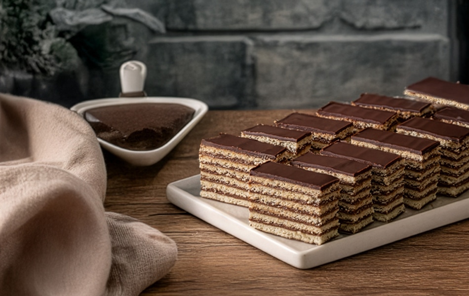 What you get is a neat rectangular cake with 5–6 super-thin layers, each one hugged by a rich cocoa-and-chocolate cream. The layers themselves are soft and pretty neutral, so the cream does the heavy lifting — chocolaty, creamy, a little decadent. Then a glossy dark chocolate glaze on top to seal the deal. Honestly, it looks formal but it eats cozy.